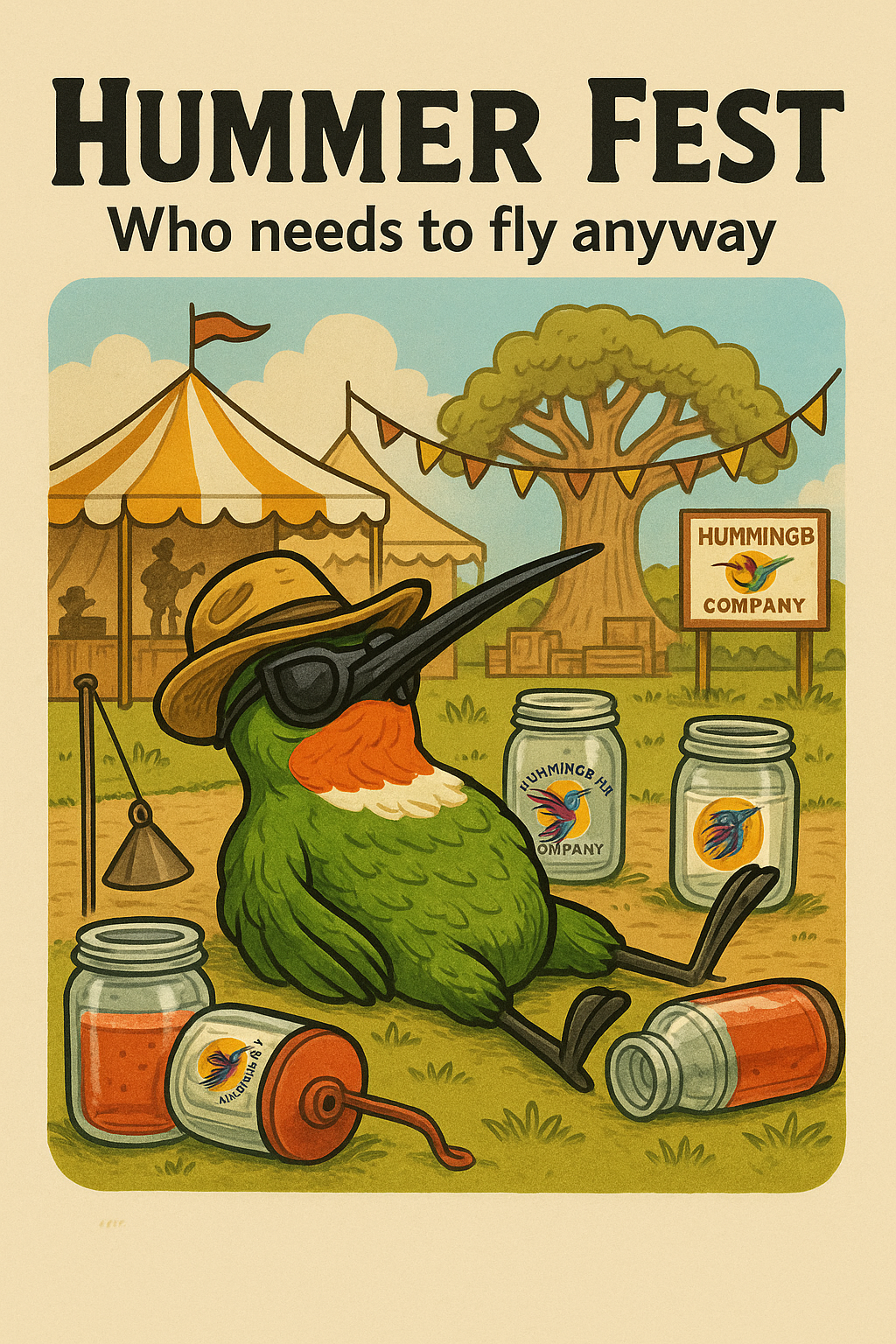Festival fun hits different when the nectar’s that good. This postcard captures the morning-after mood of Rockport’s HummerBird Festival—where one too many sips has our feathered friend grounded and groggy. A hilarious tribute to the festivities, the feeder mix, and the birds who party hardest.